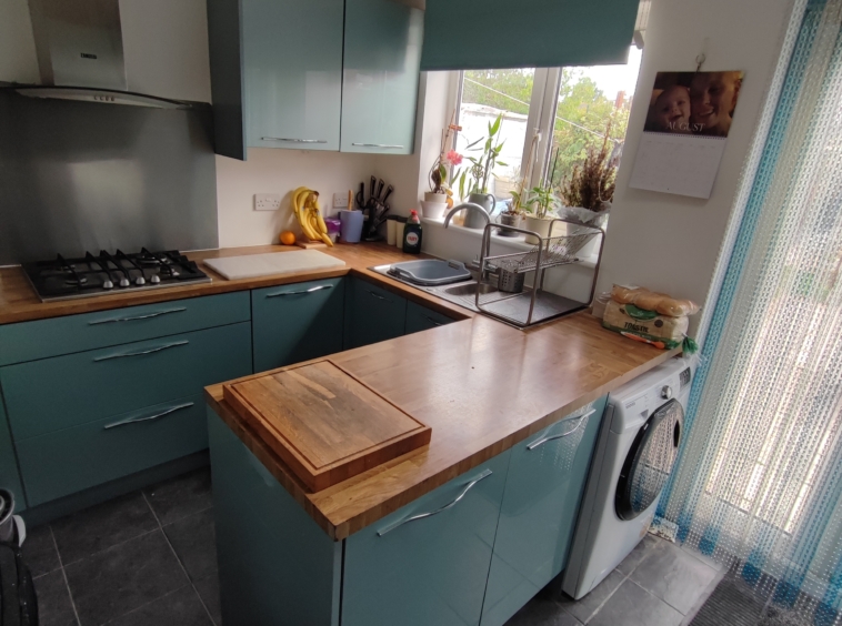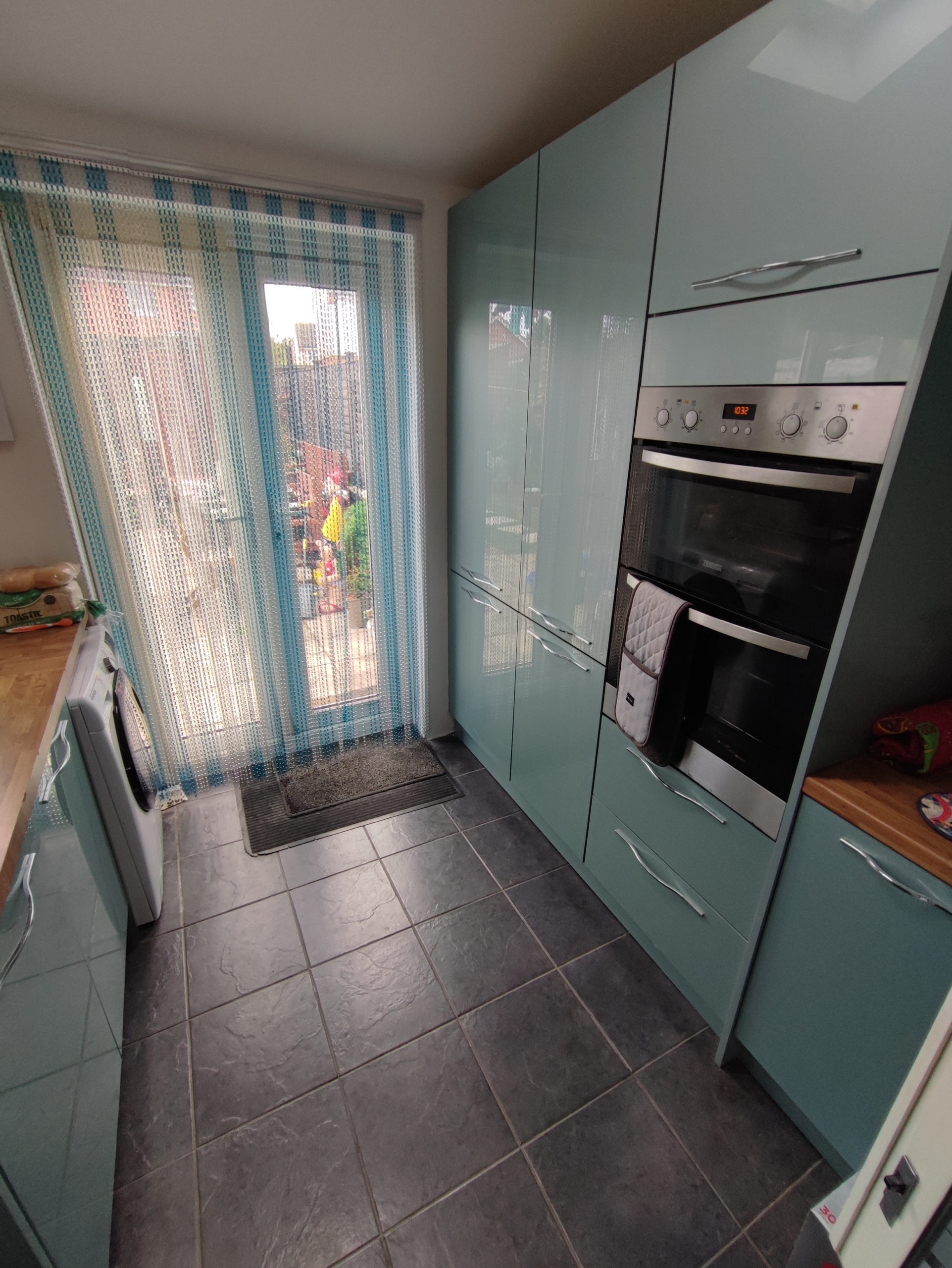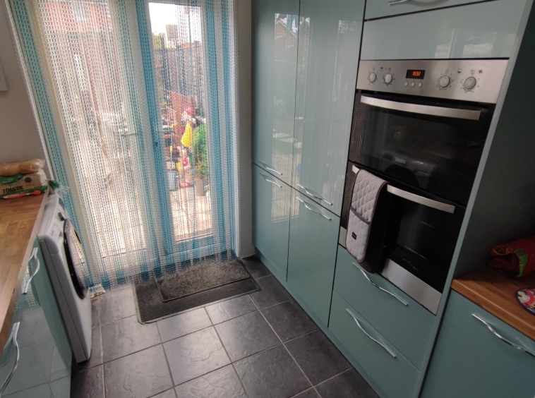 Kitchen – (4m x 2.5m) Selection of gloss finished wall and floor cabinets with built in double oven, separate hob and extractor, built in Fridge freezer, double chrome sink with chrome mixer tap, Plumbing for Washing machine, Power points, Tiled floor, D/G window with view of the garden and D/G patio doors leading to garden.