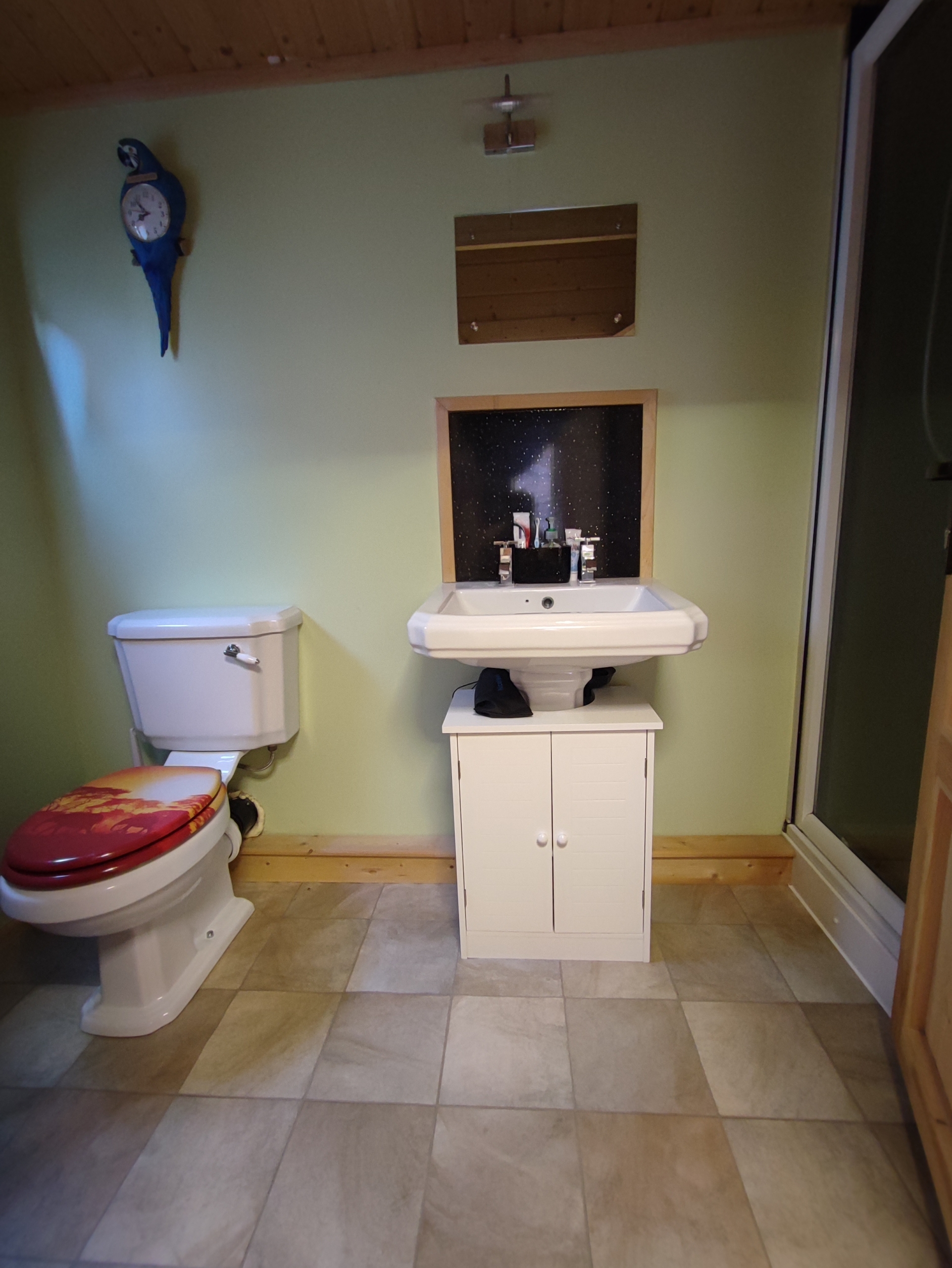En-suit shower room -(1.39m x 2.96m) low level w/c, sink with pedestal, large double electric shower enclosure, lino floor and D/G frosted window.