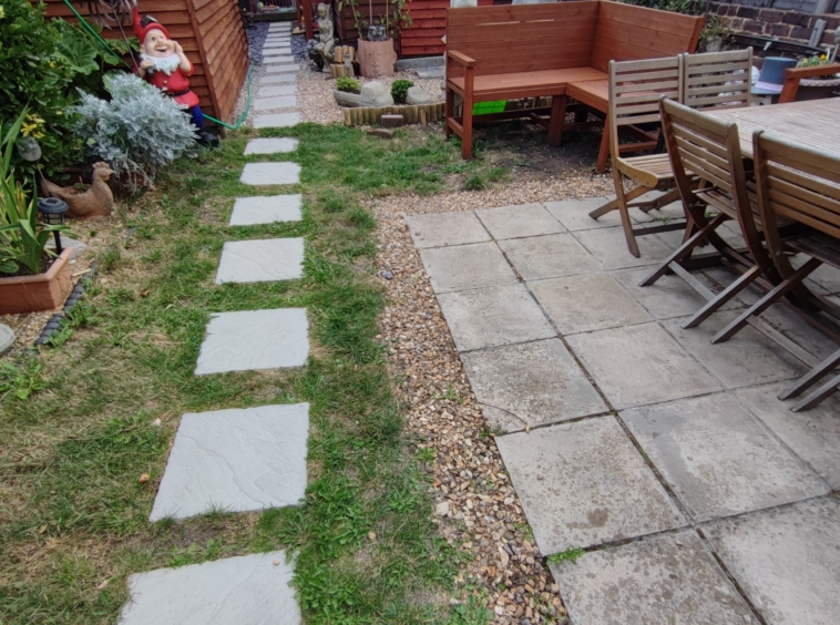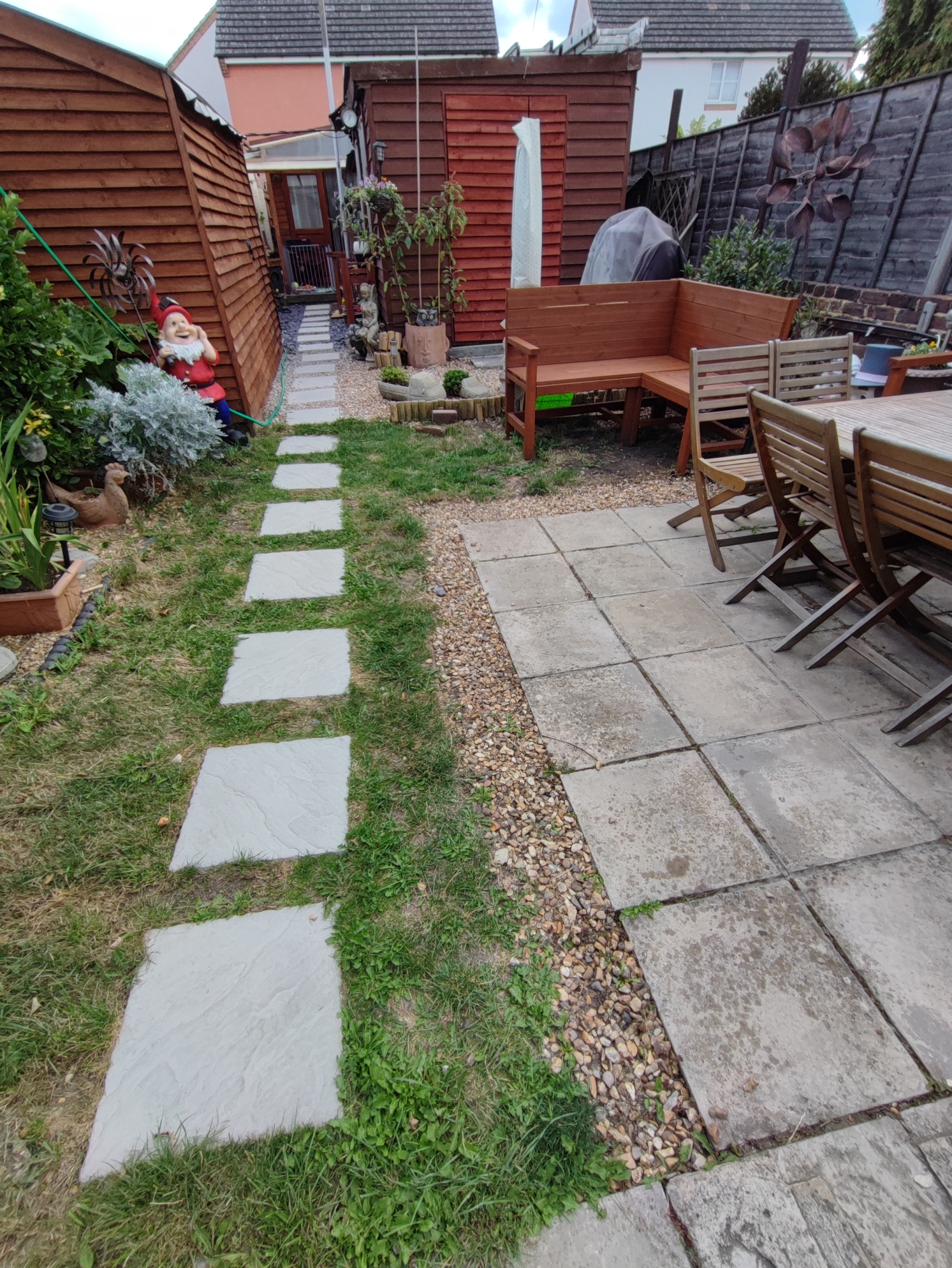 Rear garden- 100ft in length with 2 wooden sheds, small patio and lawn area with stepping stones to decorative stone and slate area leading to